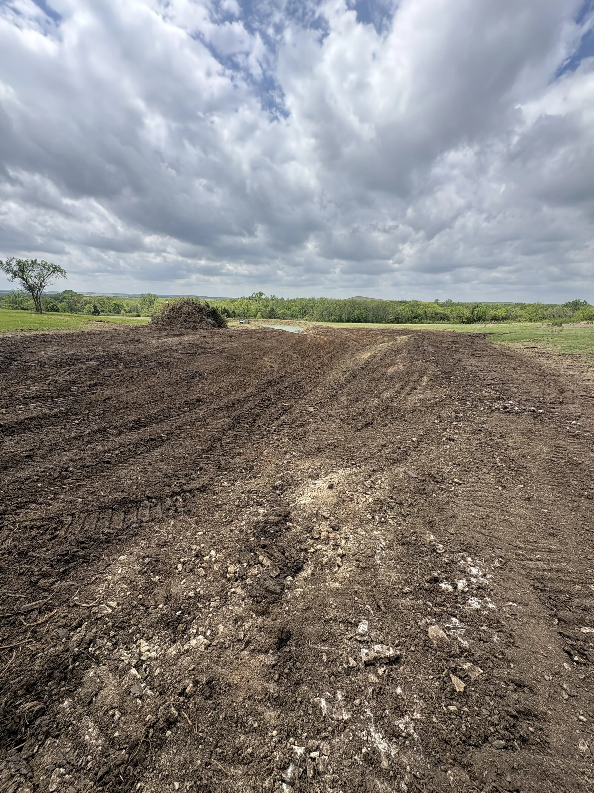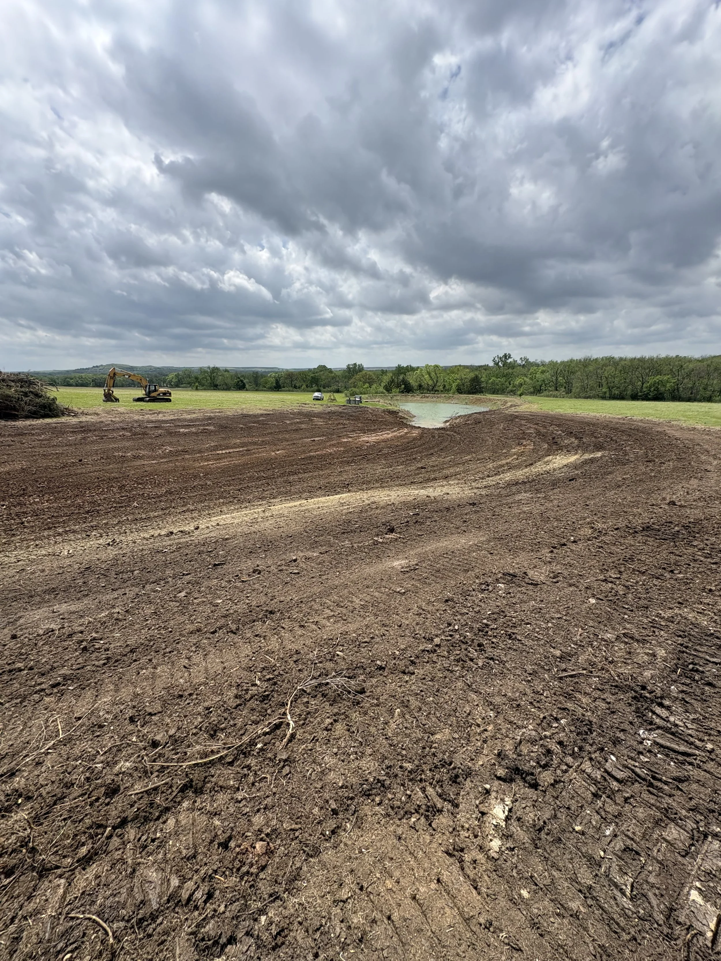 Before work began, the area consisted of brush, trees, and uneven ground that limited proper runoff into the pond. After clearing the vegetation, we graded the inlet and constructed a terrace to direct water efficiently while protecting the surrounding land.