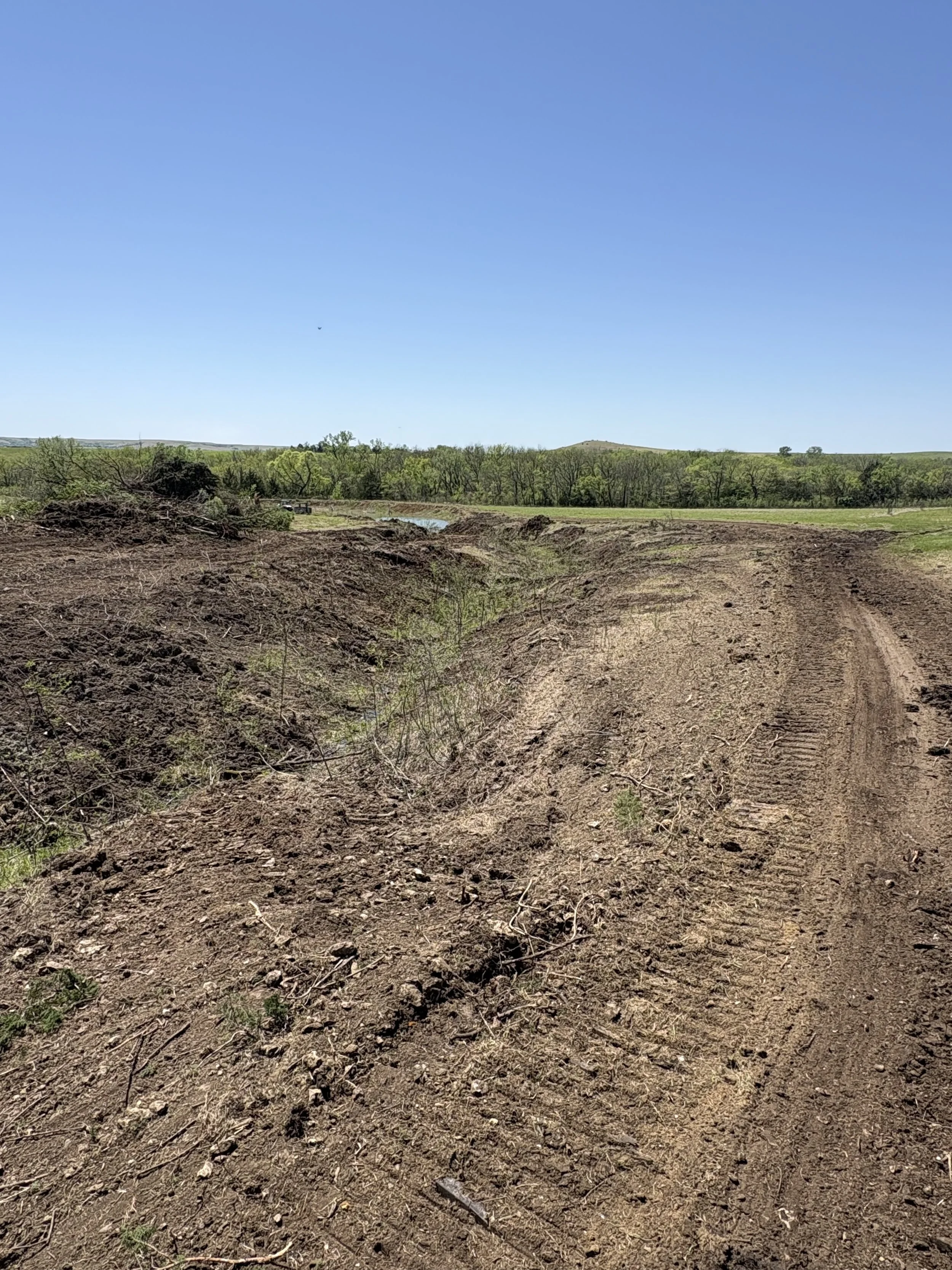 The pond water inlet was graded to establish proper water flow into the pond while creating a smooth surface for drill seeding. This helps control erosion, reduce sediment runoff, and maintain the inlet area long-term.